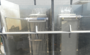 生物碳纖維平板膜組件是將過濾膜與生態(tài)碳纖維復(fù)合材料合理地結(jié)合在一起,對污水先經(jīng)過濾膜過濾,再經(jīng)生態(tài)碳纖維復(fù)合材料進一步吸附凈化,提高了清水的純度和潔凈度并提高了平板膜組件的耐污性和膜通量及使用壽命。